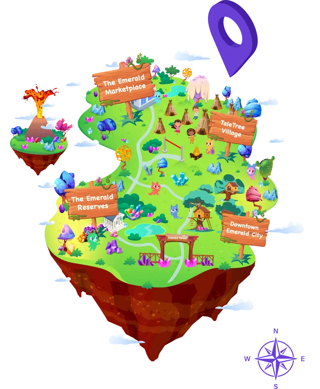 테일트리 아이들은 '에메랄드 숲'에서 탐색하고, 공유하고, 긍정적으로 소통하며 행복하게 성장 합니다. ‘에메랄드 숲’은 Downtown Emerald City, Taletree Village, The Emerald Reserves, The Emerald Marketplace 등으로 구성되어 있으며, 계속 진화해 갑니다.
