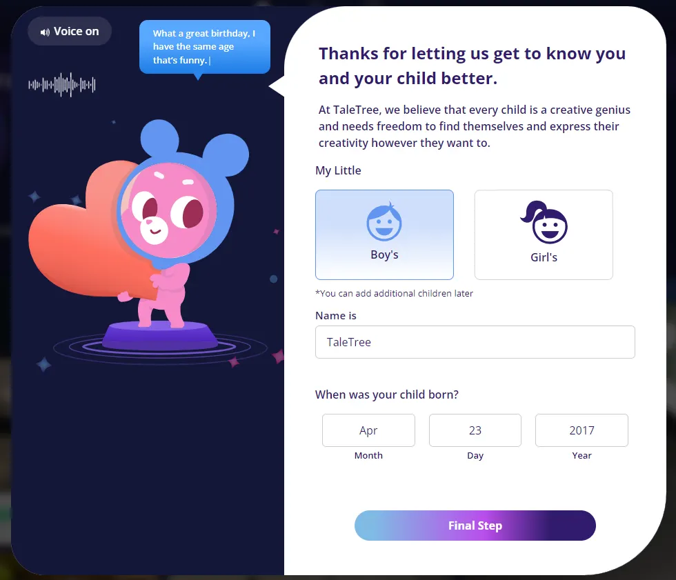 어린이 계정을 생성해 주세요. 입력된 별명(Nickname)과 비밀번호(Password)는 어린이 계정의 로그인을 위한 아이디와, 비밀번호로 사용됩니다.